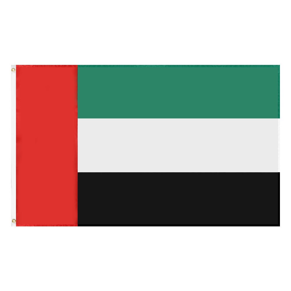 Scopri la bandiera degli Emirati Arabi Uniti, realizzata al 100% in poliestere di altissima qualità. Questa bandiera è progettata per durare nel tempo. Presenta colori vivaci che non mancheranno di attirare l'attenzione. Inoltre, è dotata di due occhielli metallici per un facile appeso. Puoi trovare sul nostro sito il migliore bandiera degli Emirati Arabi Uniti.