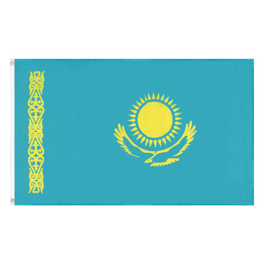 Scopri la bandiera del Kazakistan realizzata al 100% in poliestere di altissima qualità. Questa bandiera kazaka è progettata per durare nel tempo. Presenta bellissimi colori vivaci che non mancheranno di attirare l'attenzione. Inoltre, è dotata di due occhielli metallici per un facile sospensione. È possibile consultare anche i nostri altri prodotti se vuoi acquistare una bandiera del Kazakistan.