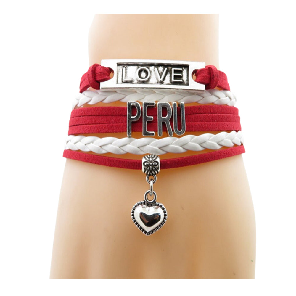 Scopri questo braccialetto con i colori della bandiera del Perù. Con il suo piccolo cuore e la scritta "love" in un simbolo infinito, questo braccialetto è un ottimo modo per mostrare tutto l'amore e l'orgoglio che hai per il tuo paese. Puoi anche consultare i nostri altri prodotti se desideri acquistare la bandiera peruviana.