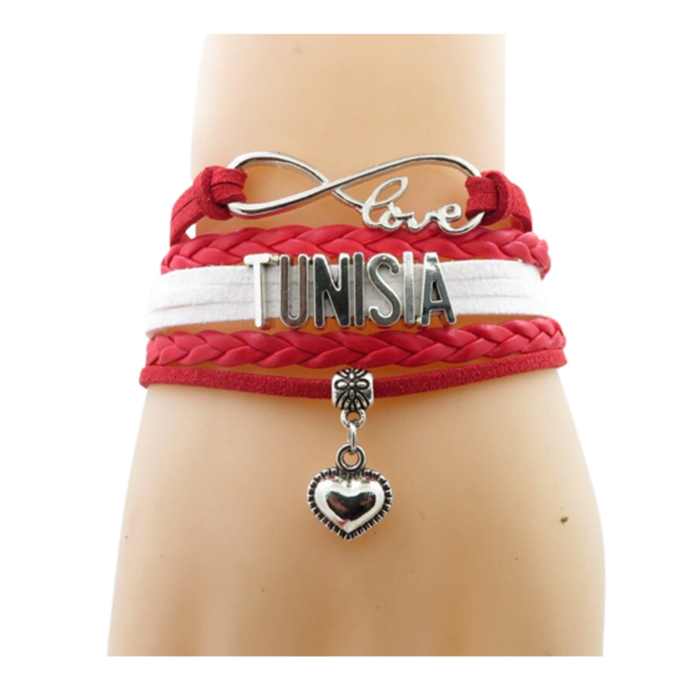 Scopri questo braccialetto con i colori della bandiera della Tunisia. Con il suo piccolo cuore e la scritta "love" in un simbolo infinito, questo braccialetto è un ottimo modo per mostrare tutto l'amore e l'orgoglio che hai per il tuo paese. Puoi anche consultare i nostri altri prodotti se desideri ordinare una bandiera della Tunisia.