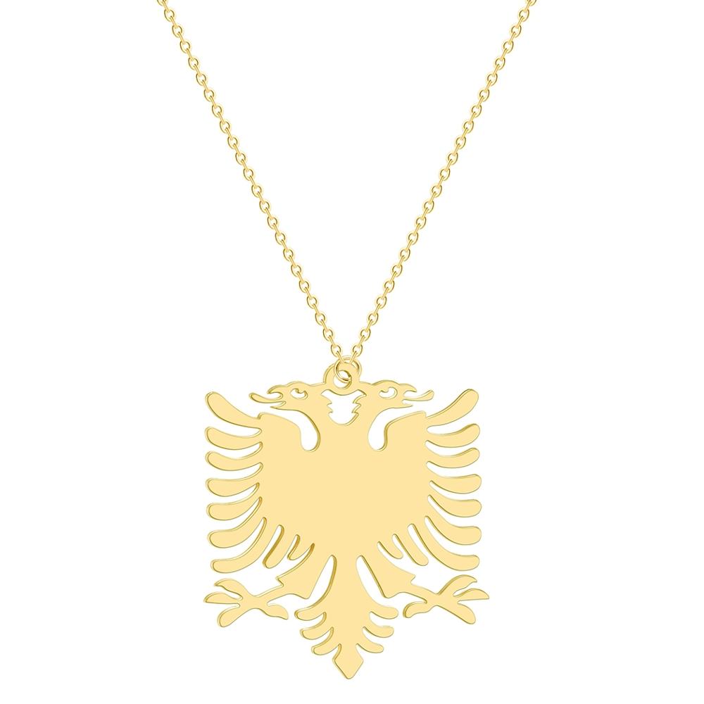Scopri questa splendida collana color oro con l'aquila dell'Albania. La collana è realizzata con materiali di alta qualità ed è disponibile in due diverse lunghezze di catena, così da poter trovare la misura perfetta. Che tu la indossi come quotidiano promemoria del tuo retaggio o che la abbinassi ai colori del tuo paese per un look festoso, questa collana è sicura di fare la sua figura. Quindi non esitare e mostra il tuo orgoglio nazionale con stile grazie a questa splendida collana dell'aquila dell'Albania. Puoi anche consultare i nostri altri prodotti se desideri acquistare una bandiera dell'Albania.