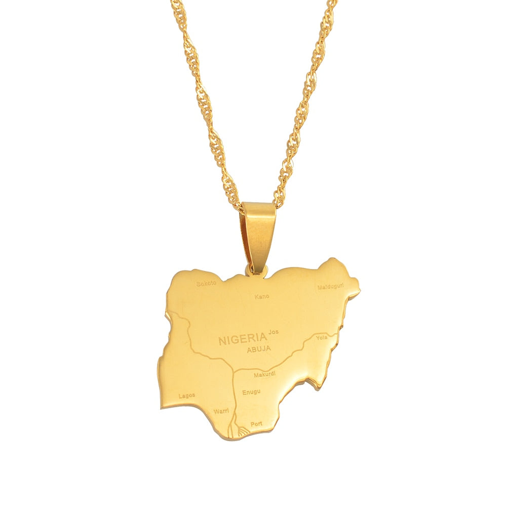 Scopri questa magnifica collana color oro con la mappa della Nigeria. La collana è realizzata con materiali di alta qualità ed è disponibile in due diverse lunghezze di catena, così che tu possa trovare la misura perfetta. Che tu la indossi come un promemoria quotidiano del tuo patrimonio o che tu la abbinassi con i colori del tuo paese per un look festoso, questa collana è sicura di fare la sua figura. Quindi non esitare e mostra con stile il tuo orgoglio nazionale con questa bellissima collana del territorio nigeriano. Offriamo sul nostro sito la vendita online della bandiera della Nigeria.